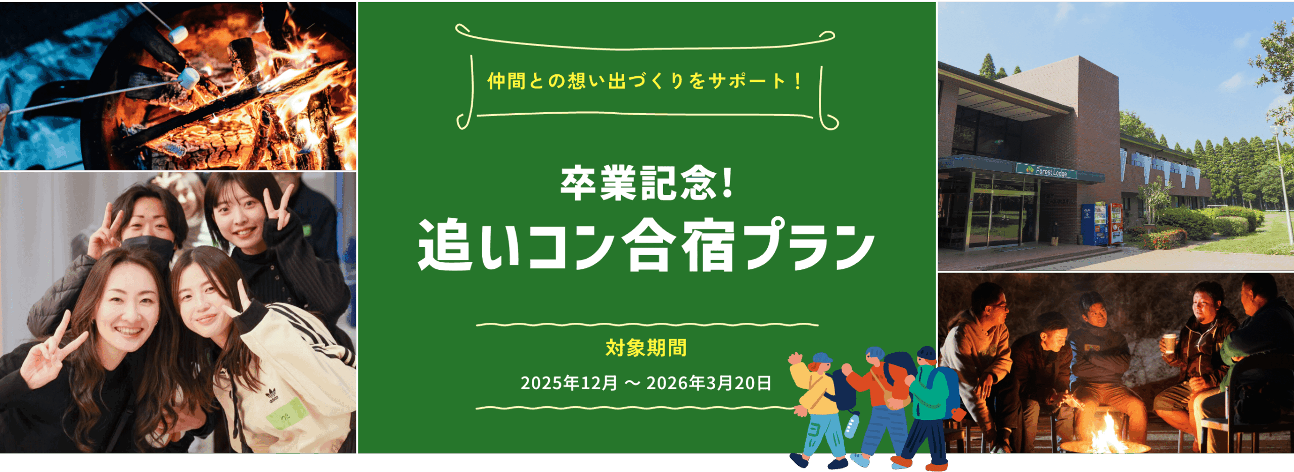 学生生活の締めくくりにぴったりな「卒業記念!追いコン合宿プラン」を期間限定でご用意しました。“仲間と自然の中で過ごす追いコン”という記憶に残る体験をつくりませんか?