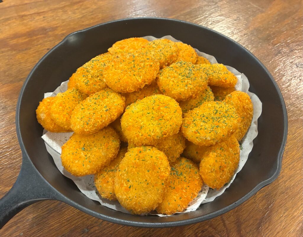 飯盒炊飯(カレー作り)をご利用の場合は、揚げたてサクサクのコロッケをトッピングでサービスします♪千葉市の竹林を整備し焼き上げた流行りの竹炭パウダーを振れば、真っ黒なカレーの出来上がり!無味無臭なのでカレーのおいしさはそのまま。人参をお花型にくりぬいたり、カレーに華やかさをプラス♪インスタ映え間違えなし!アウトドアでも可愛く美味しくみんなの笑顔も満開☺
