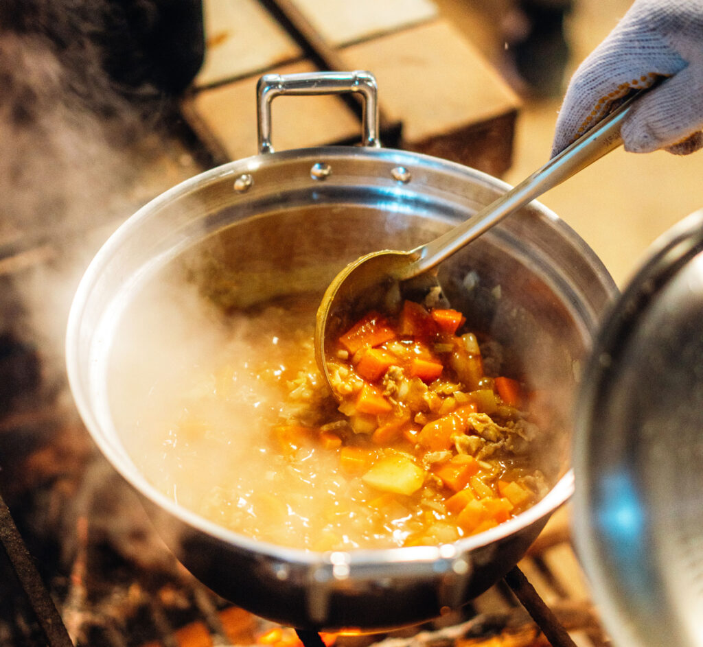 みんなで火を起こしてご飯を炊く。協力しながらつくった飯盒ご飯を自然の中で食べる一皿は忘れられない味です。